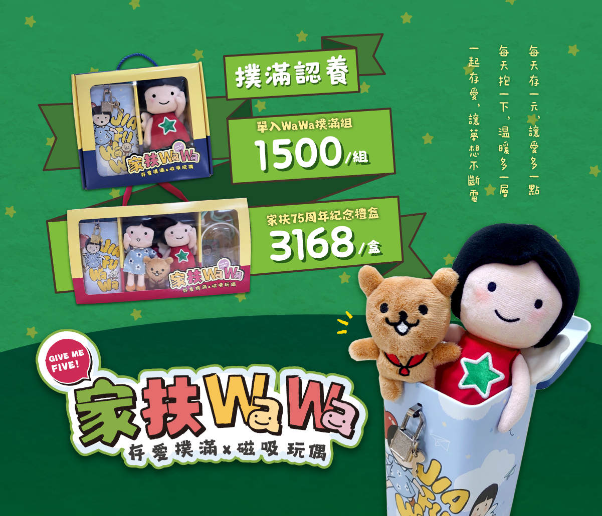 組合裡都有絨毛玩偶公仔+可愛鐵盒撲滿,有兩款玩偶:家扶WaWa和兒保WaWa,可以選擇,還有小驚喜等你來發現!