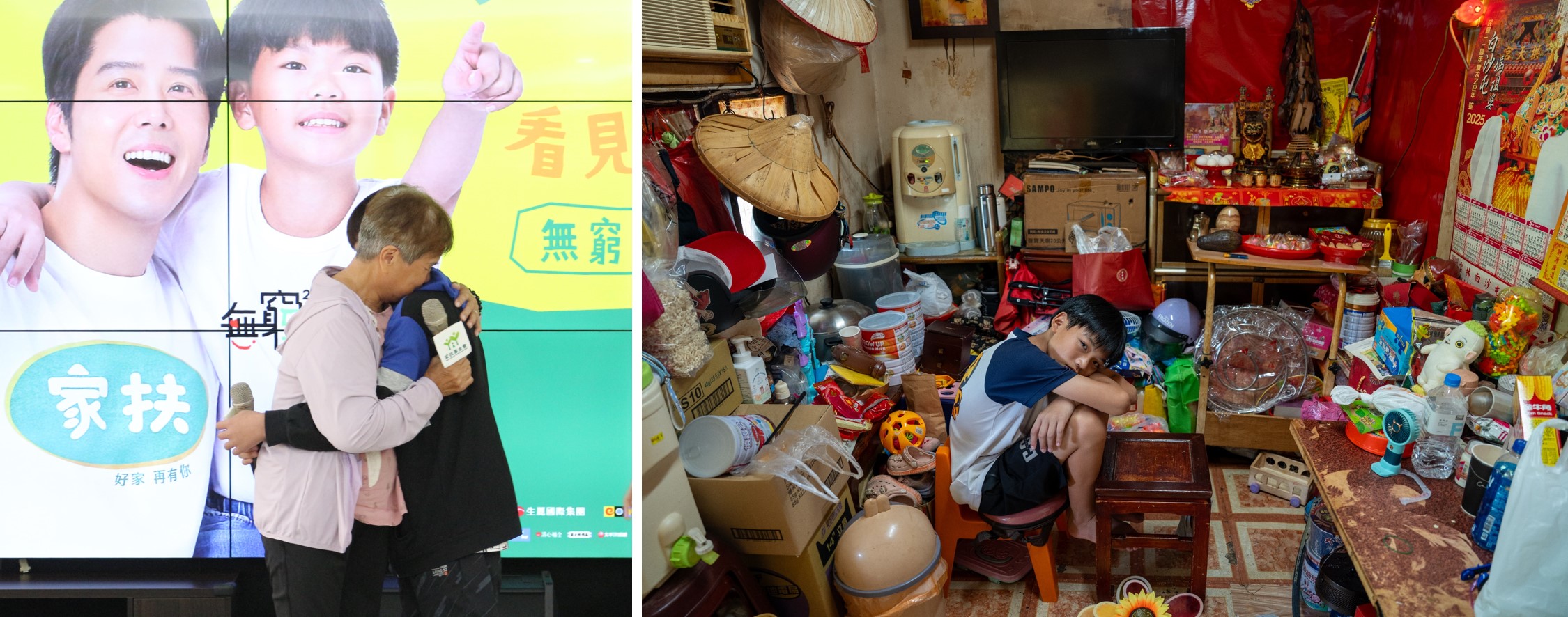 《弱勢家庭居住狀況調查》顯示,弱勢家庭平均每人可用居住空間僅5.92坪,不及台灣自有住宅人均居住面積的一半。調查亦發現,在有房租/房貸的家庭中,有69.3%的家庭憂心無法如期繳交;且因房租/房貸而影響各種支出規劃,如在飲食上有71.3%、在生活上有74.7%。無窮世代CF《貧窮-孩子眼中的世界》中,翔翔提到:「房租、水電費都繳不起時,我很擔心會一直這樣」。兄妹倆和外曾祖母相依為命12年,一家三口擠在12坪的家,牆面多處壁癌與裂痕,在廚房水龍頭旁的「大澡盆」成了浴室,狹小房間裡以床為椅,翔翔在角落邊的書桌與微弱燈光下寫功課。調查顯示,弱勢家庭房屋的屋況差(如漏水漏電、排水管易堵塞、壁癌、發霉)高達71.3%;設備(家電、家具)缺乏、老舊或破損的則有54.8%;設施(如門、窗、馬桶)缺乏、老舊或破損的有56.3%。環境淬鍊弱勢家庭為各種生活所需要應變,遇到問題翔翔也慣於自己想辦法,不希望造成外曾祖母更多負擔,也常做著能幫忙減輕她負擔的事。翔翔說:「如果可以改變,想給阿祖買一棟房子,讓她住得舒服一點!」。