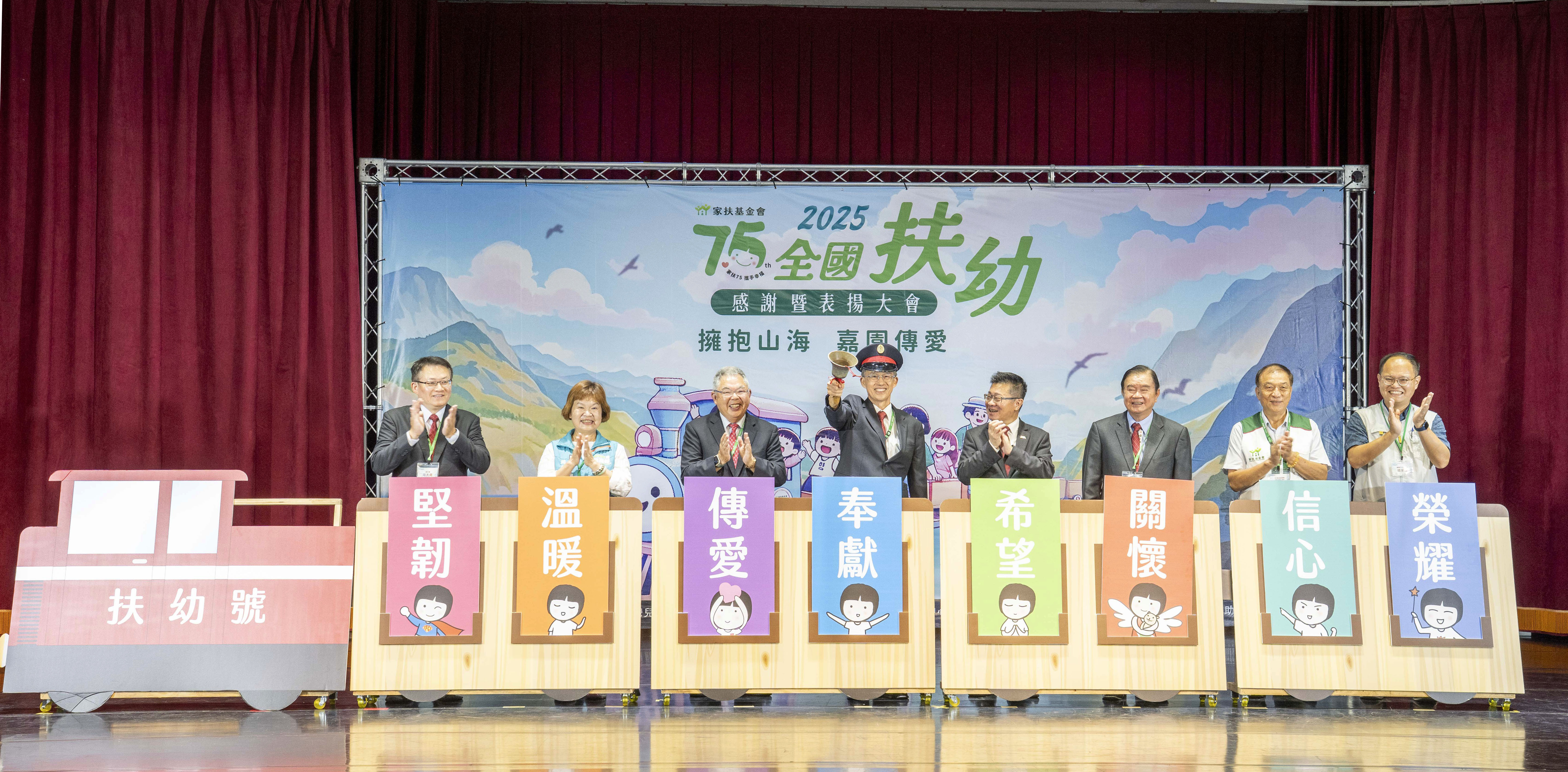 家扶基金會今(13日)於嘉義縣人力發展所—創新學院舉辦「2025年全國扶幼感謝暨表揚大會」,表彰超過200名的扶幼委員及楷模,感謝他們長年在各自崗位上無私奉獻,也致敬每一股支持孩子成長、不可忽視的力量。會場上,「扶幼號」阿里山小火車緩緩駛入舞台,象徵家扶即使穿越重重山海,依然將祝福送達每一個孩子身邊。扶幼旅程的每一哩路,皆承載著無數動人的風景與感動,隨著家扶基金會董事長劉邦富搖響代表啟程的鈴鐺,扶幼號再度出發,把溫暖送往更多需要愛的角落。